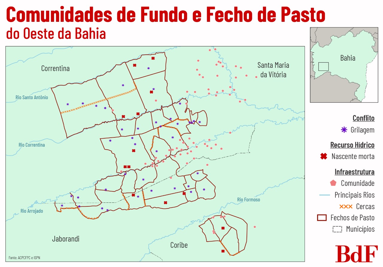 O automapeamento identificou 69 nascentes protegidas por famílias fecheiras, fundamentais para abastecer rios como Correntina, Formoso e Arrojado, que alimentam o rio Corrente, afluente do São Francisco. Também foram identificados 19 pontos de conflito envolvendo grilagem e disputas territoriais. A escassez de água tornou-se um problema crítico, reforçado por episódios como a Revolta de Correntina, em 2017.