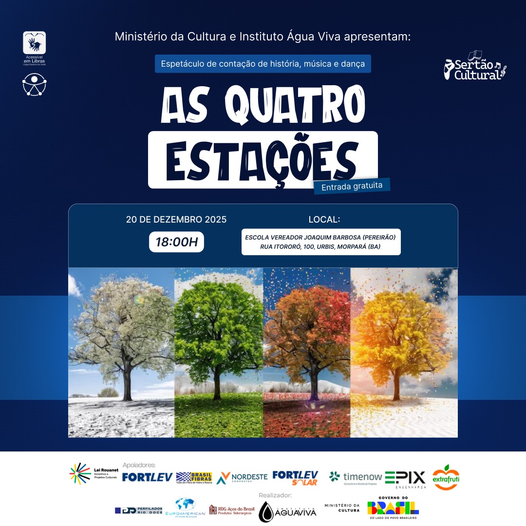 O Ministério da Cultura, em parceria com o Instituto Água Viva, realizará em Morpará o espetáculo “As Quatro Estações”, uma apresentação gratuita que une contação de histórias, música e dança para refletir sobre os ciclos da vida e da natureza. O evento acontece no dia 20/12, às 18h, na Escola Vereador Joaquim Barbosa (Pereirão).
