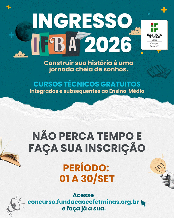 O Instituto Federal da Bahia (IFBA), campus Barreiras, abriu inscrições para o Processo Seletivo de Estudantes 2026, oferecendo 240 vagas gratuitas em cursos técnicos, distribuídas nas modalidades Integrado ao Ensino Médio e Subsequente.