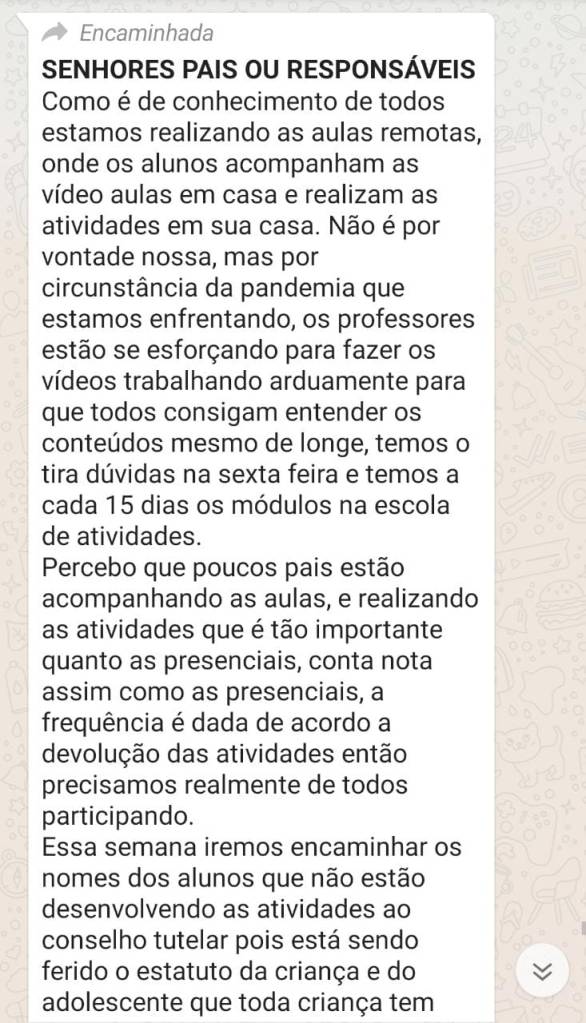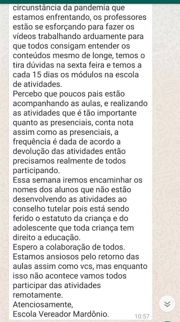 Bom dia, gostaria de deixar claro aqui no grupo que desde o início deixaram a desejar no apoio às famílias. Mas, relevei porque entendi que o momento que estamos vivendo não é fácil e não está sendo pra ninguém.
