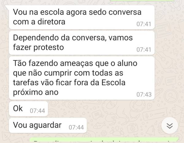 Sobre as vagas, nem isso vocês podem nos ameaçar. O prefeito mudou e certamente a direção da escola mudará também. Portanto, estarei fazendo uma denúncia em relação as ameaças, inclusive no Conselho Tutelar.