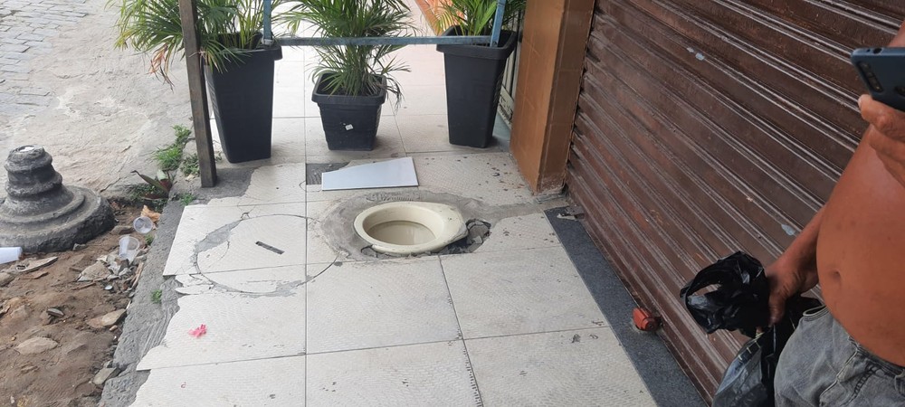A privada, que estava coberta por um pedaço de piso de cerâmica e podia ser usada por qualquer pessoa, foi fechada com cimento pelo dono do estabelecimento. Ainda assim, durante a fiscalização nesta sexta, a Sedur avaliou que o serviço foi mal feito e apresenta riscos de acidente.